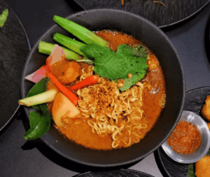 Duck Blood Curry Mee is a hidden gem located inside a Malaysian-style café. The dish features noodles served in a savoury-sweet white curry broth made with coconut milk, freshly prepared every day. Among the many toppings available, the roasted pork stands out for its rich flavour and crispy texture. Be sure to add their homemade chilli sauce, which enhances the dish with an extra kick of spice and depth.